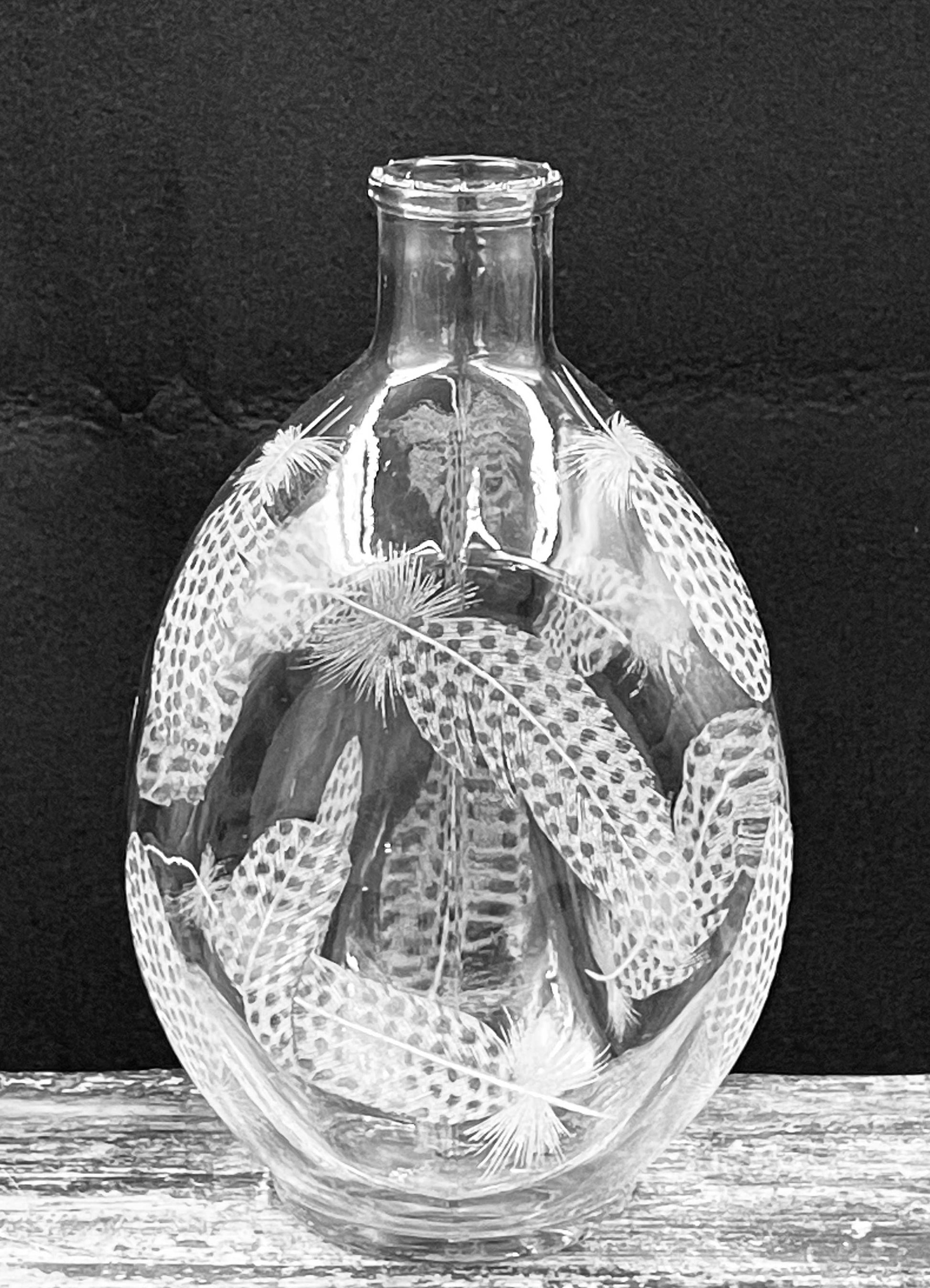 Dimple Bottle, Engraved with Guinea Fowl Feathers