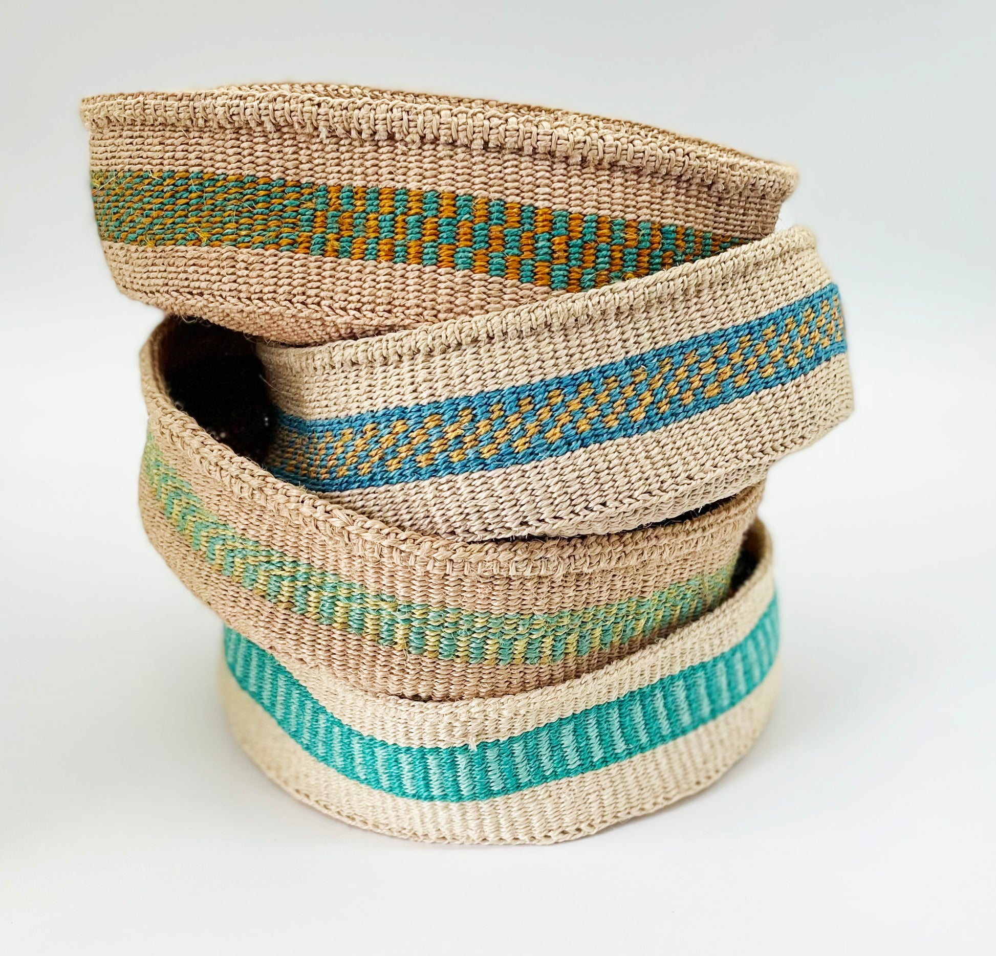 Hand woven natural Sisal Bread basket with a variety of coloured bands, Blue, Black and Burgundy.We are thrilled with these new additions. Ideal for breads, biscuits or even fruit.