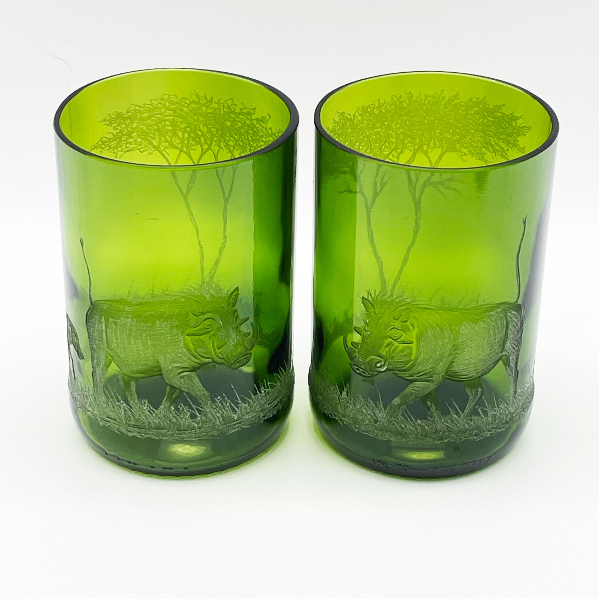 Hand engraved re-cycled Green Glass Bottle candle holder, with Warthog.
