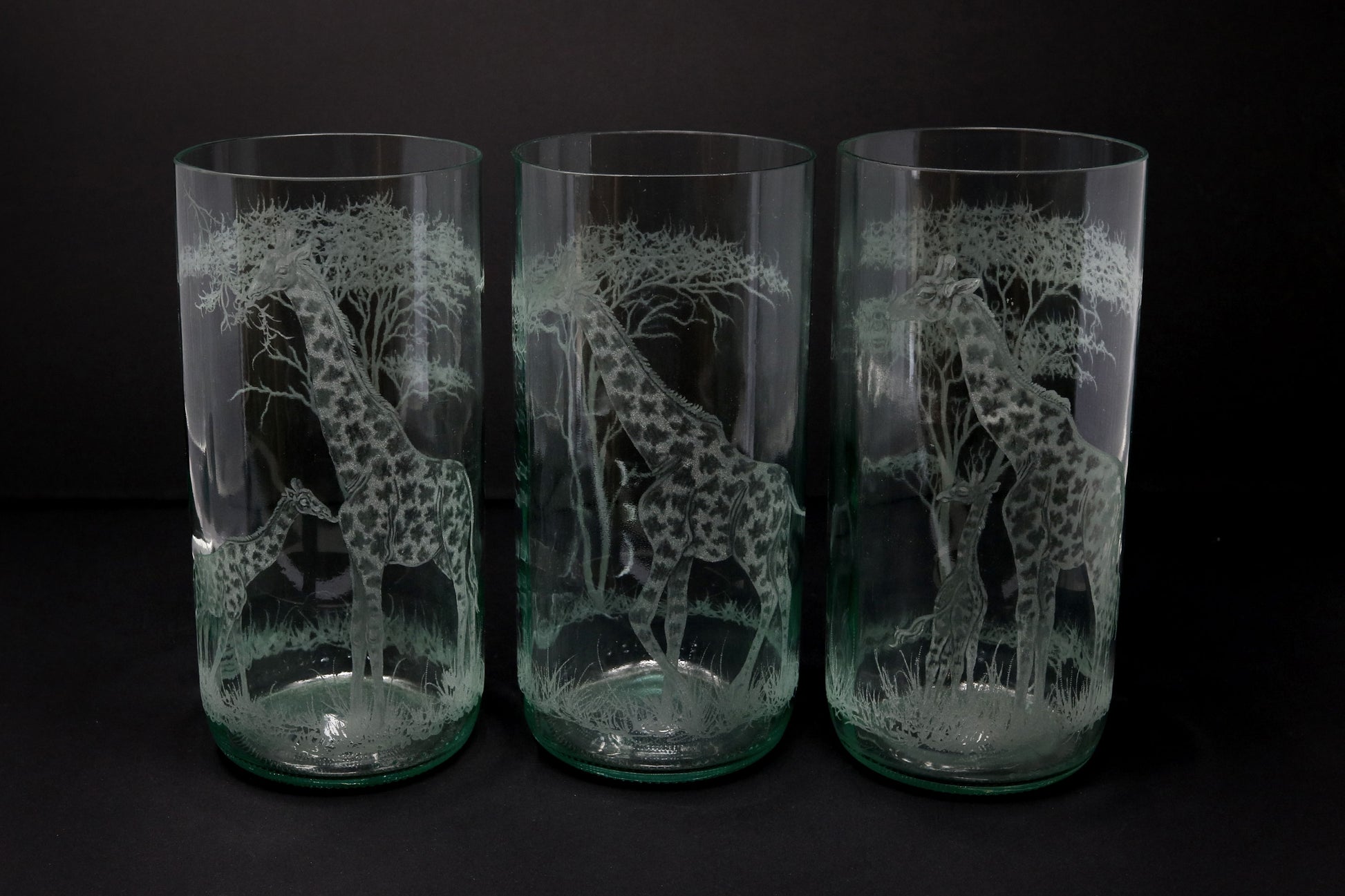 Tall glass storm lantern, hand engraved re-cycled wine bottles with Giraffe. Due to the hand engraved nature some images may vary. These also work well as vases.
