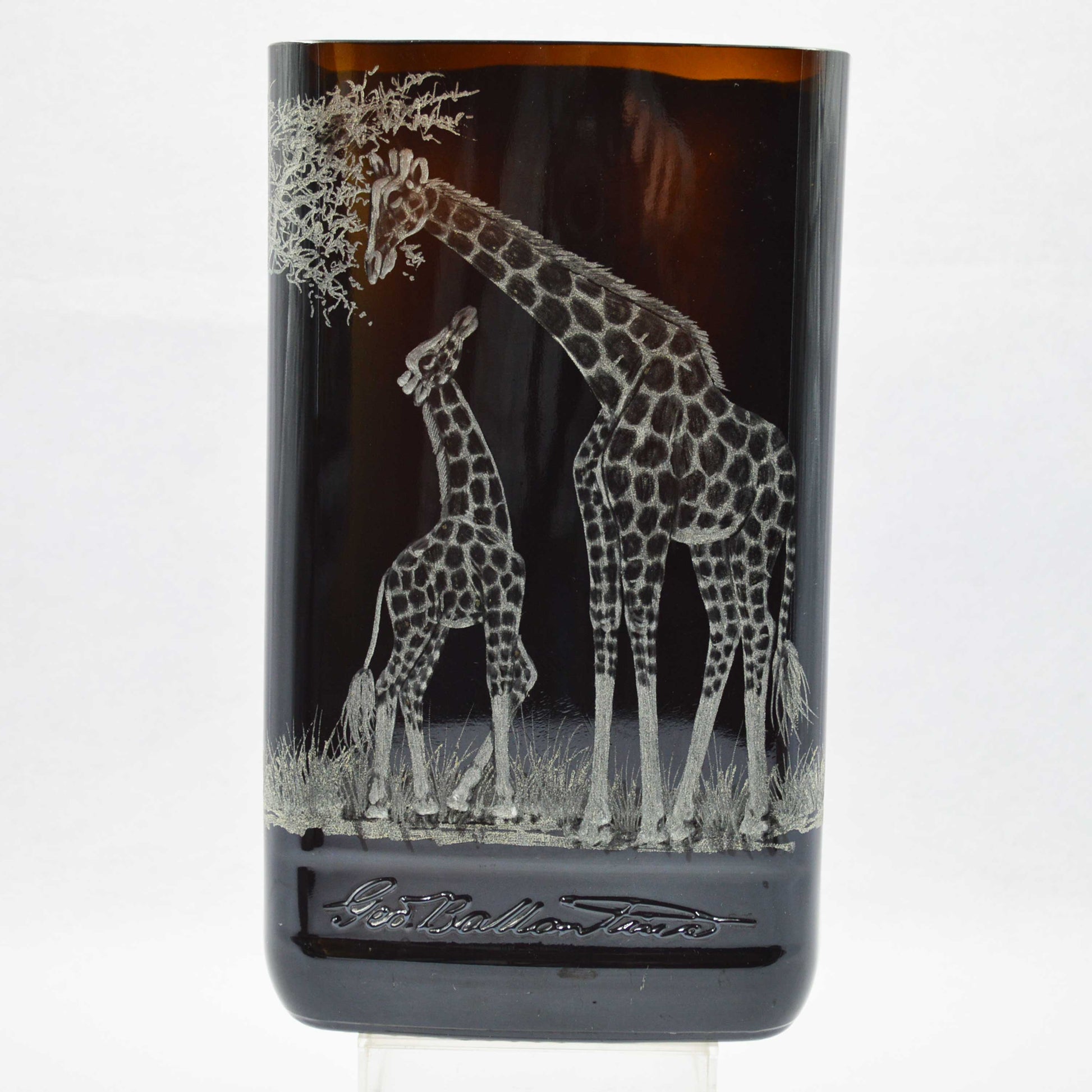 Extra large brown glass storm lantern, engraved with giraffe.