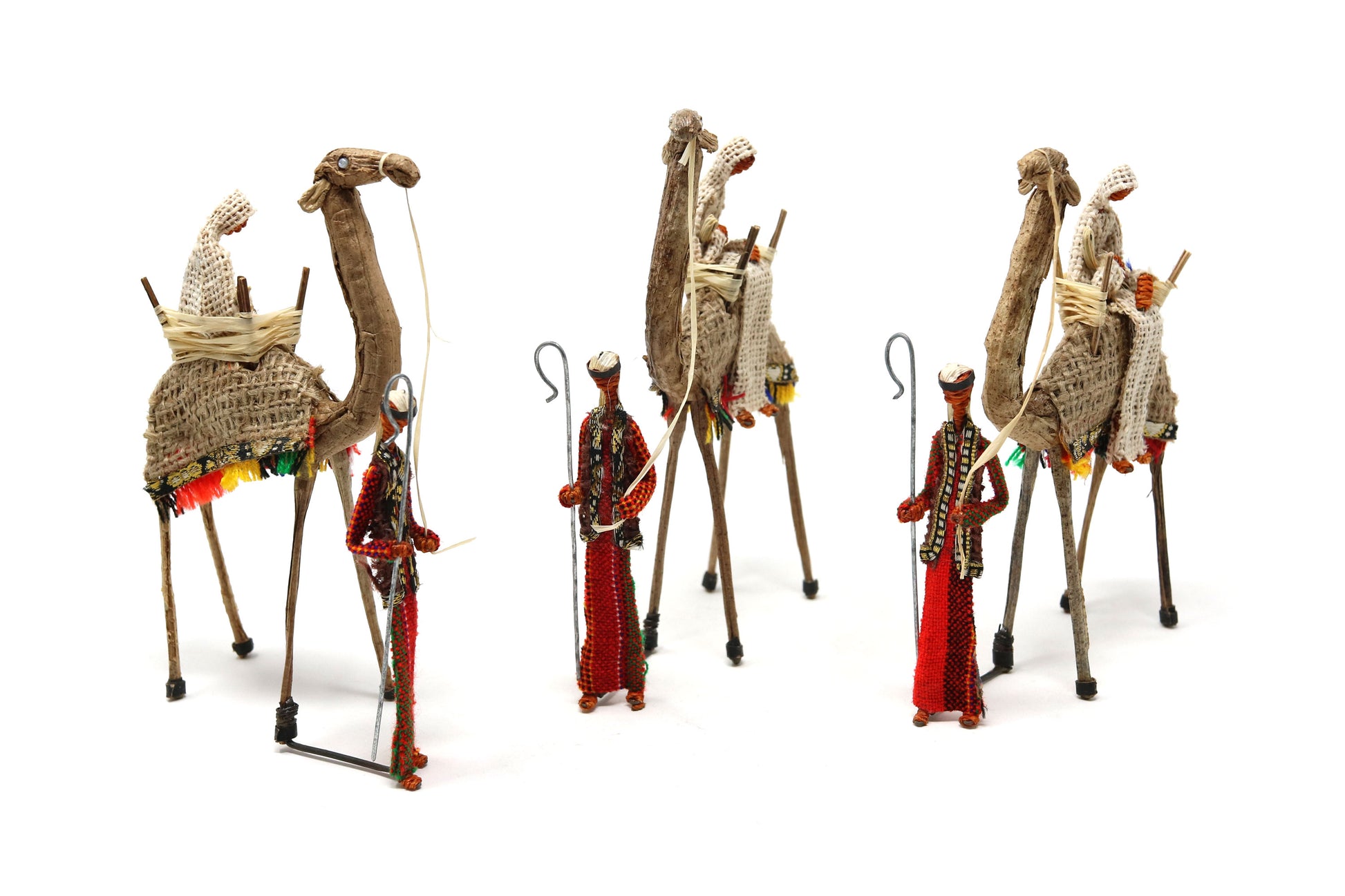 Handmade stand alone ornaments using wire, Sisal, Shuka fabric and hessian. Joseph and Mary with Babe on a Camel. (three sets pictured).