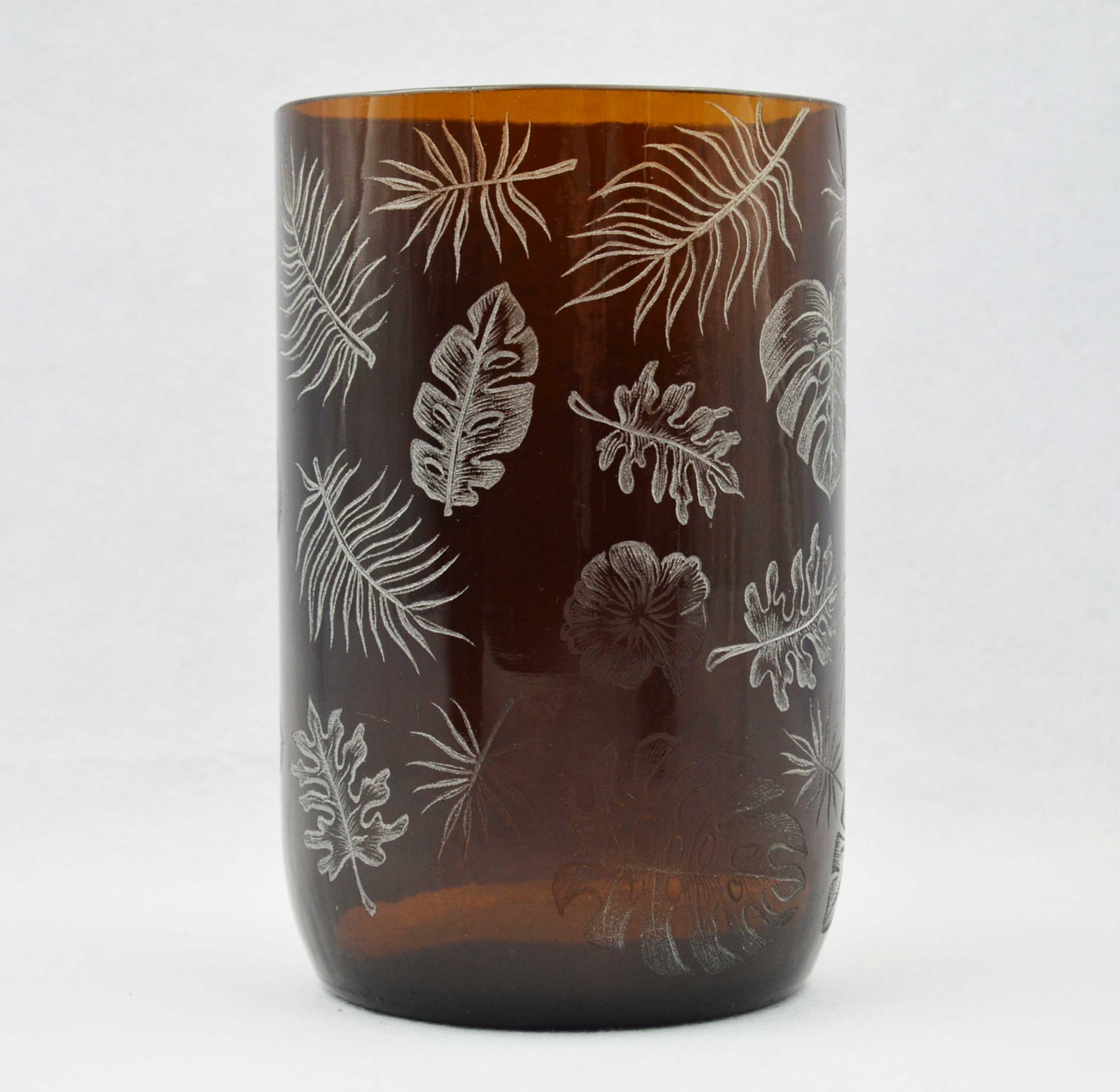 Single large brown glass bottle storm lanterns, engraved with tropical leaves.