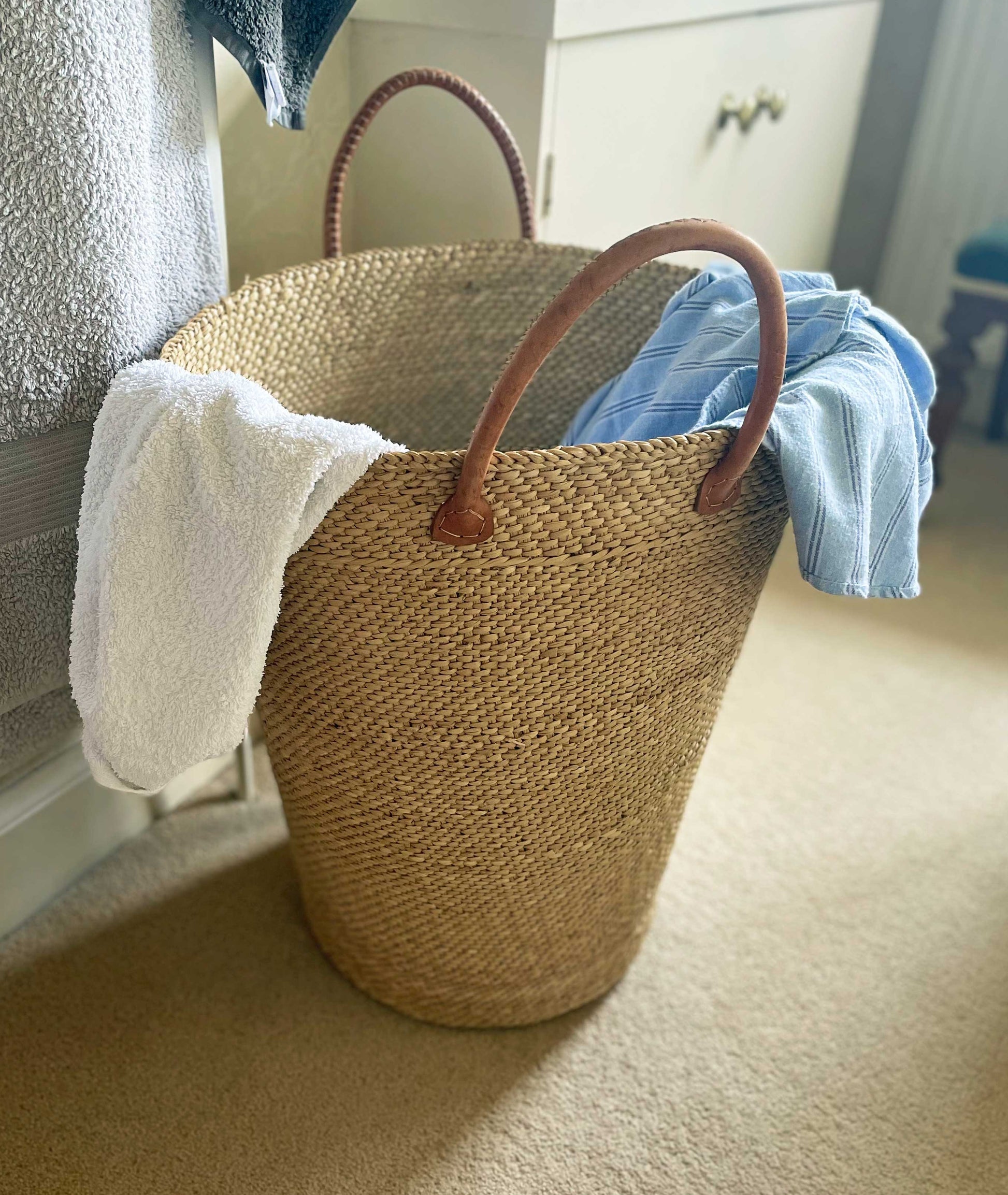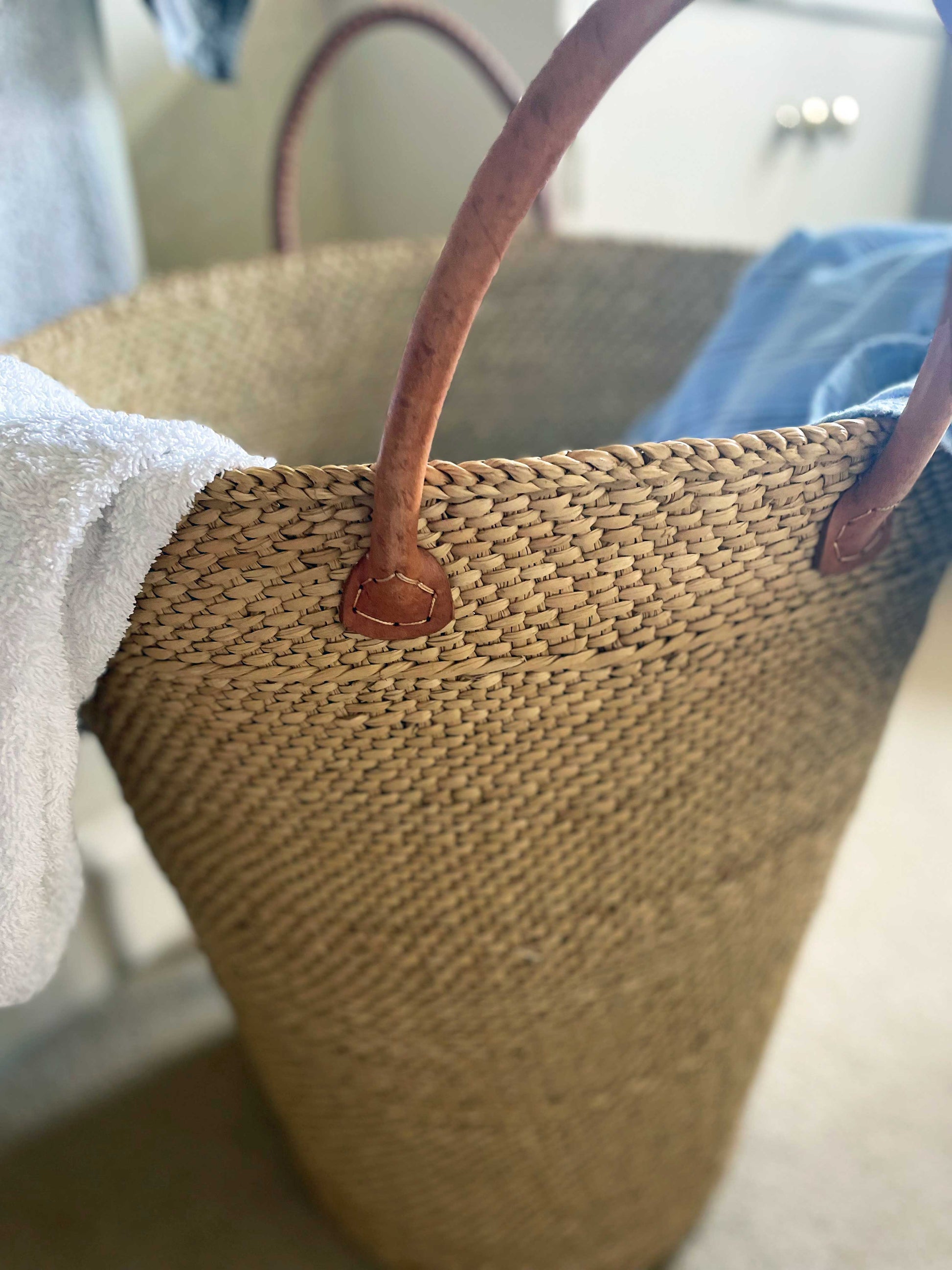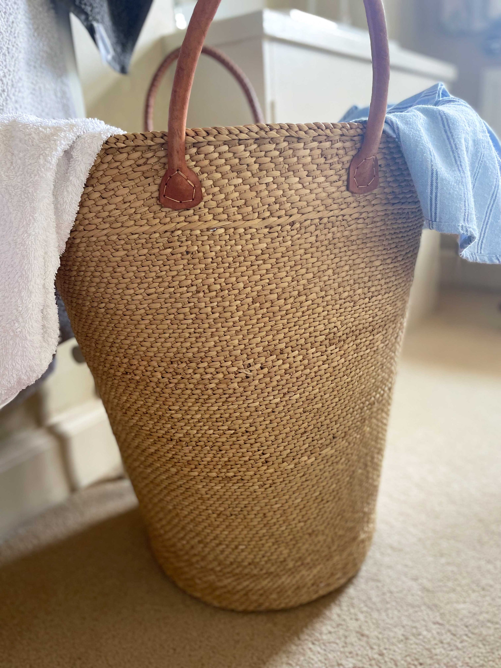 Handwoven , sea grass laundry basket made with Tanzanian Sea grass fibre, renowned for strength & durability. Finished with strong leather handles.