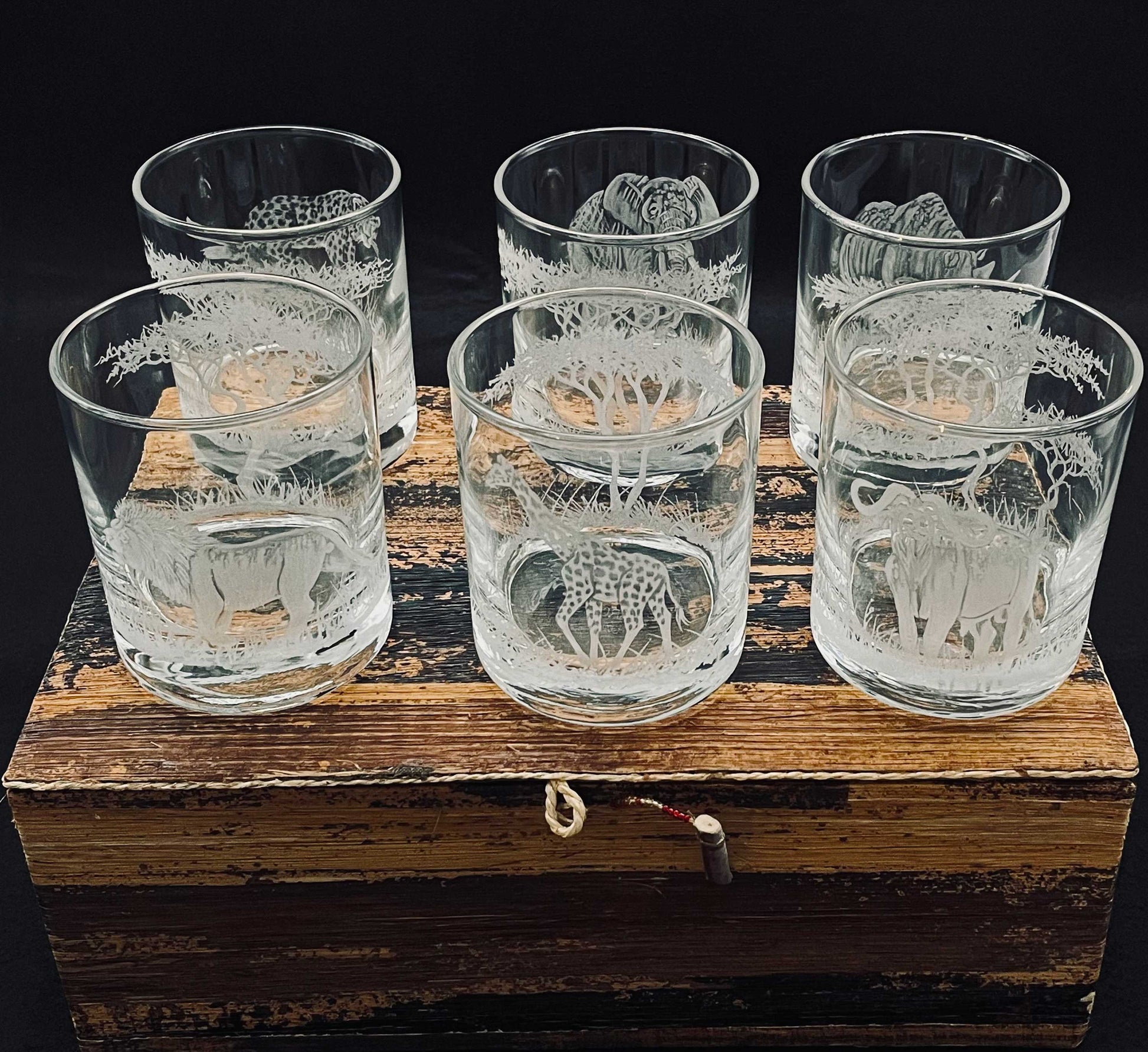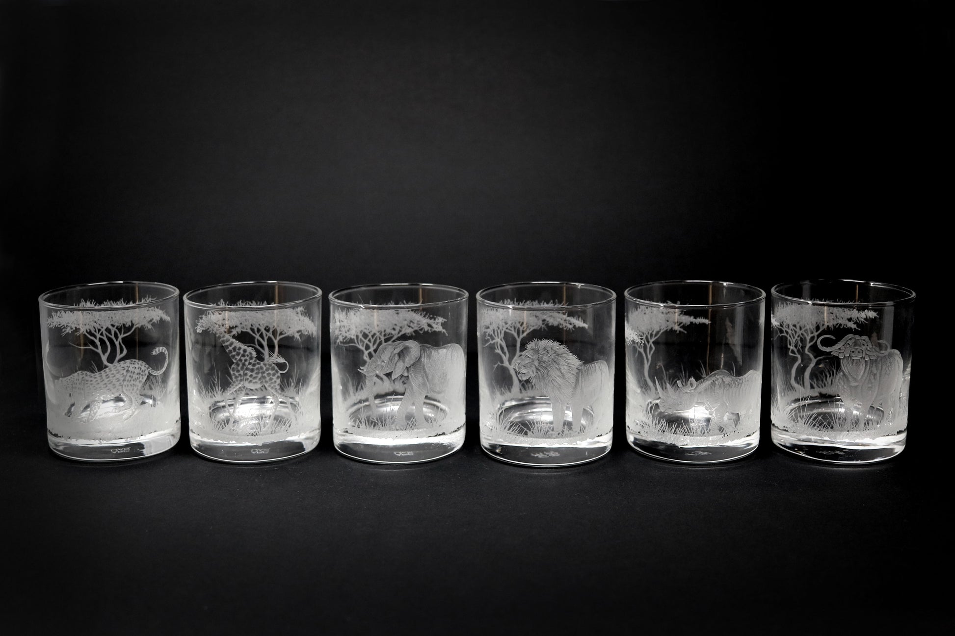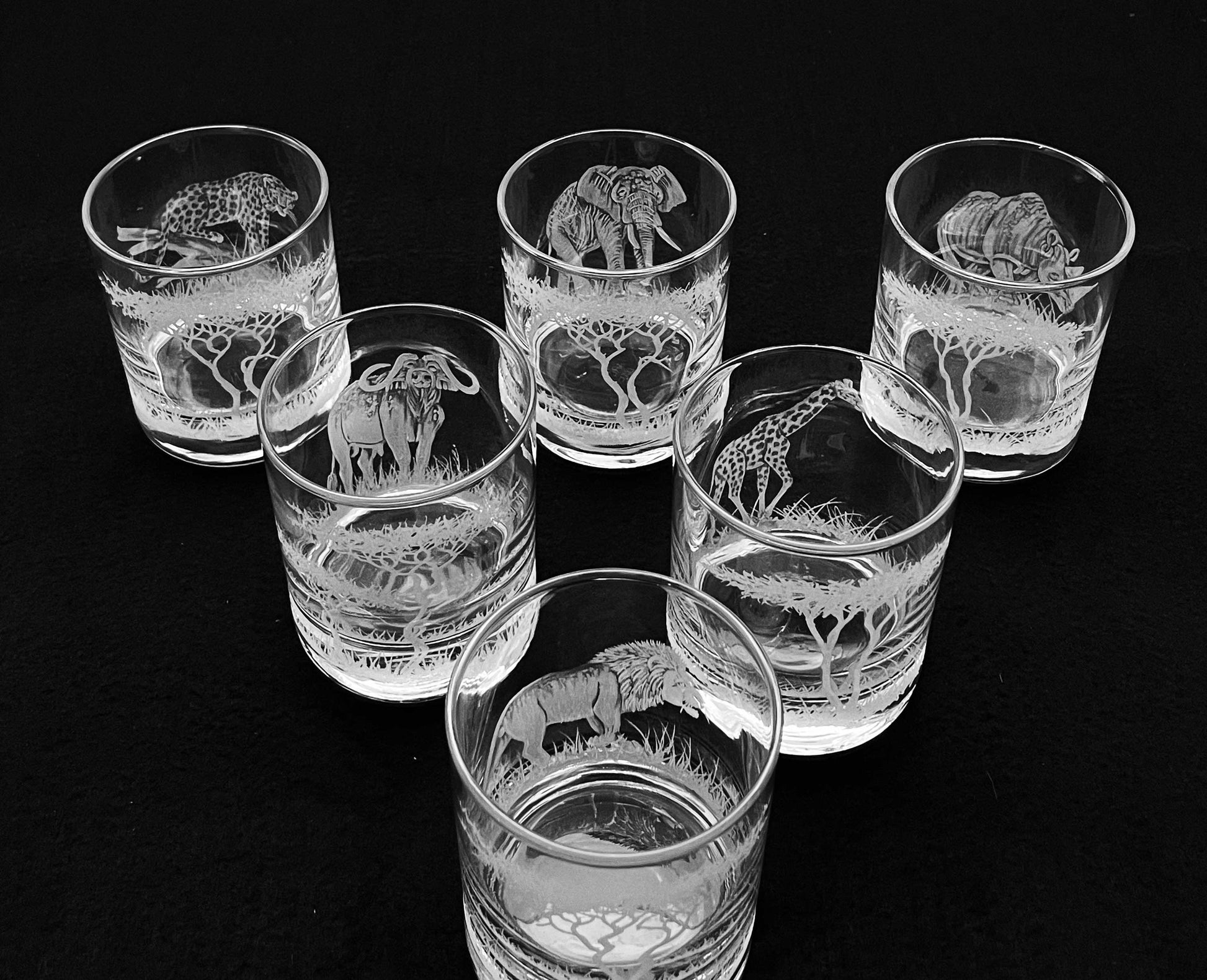 Set of six tumbler glasses, engraved with the big 5 animals plus giraffe.