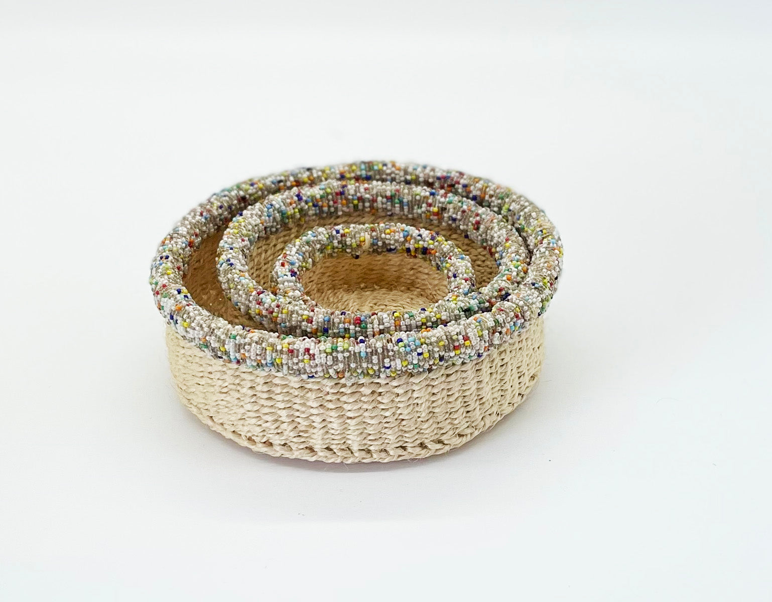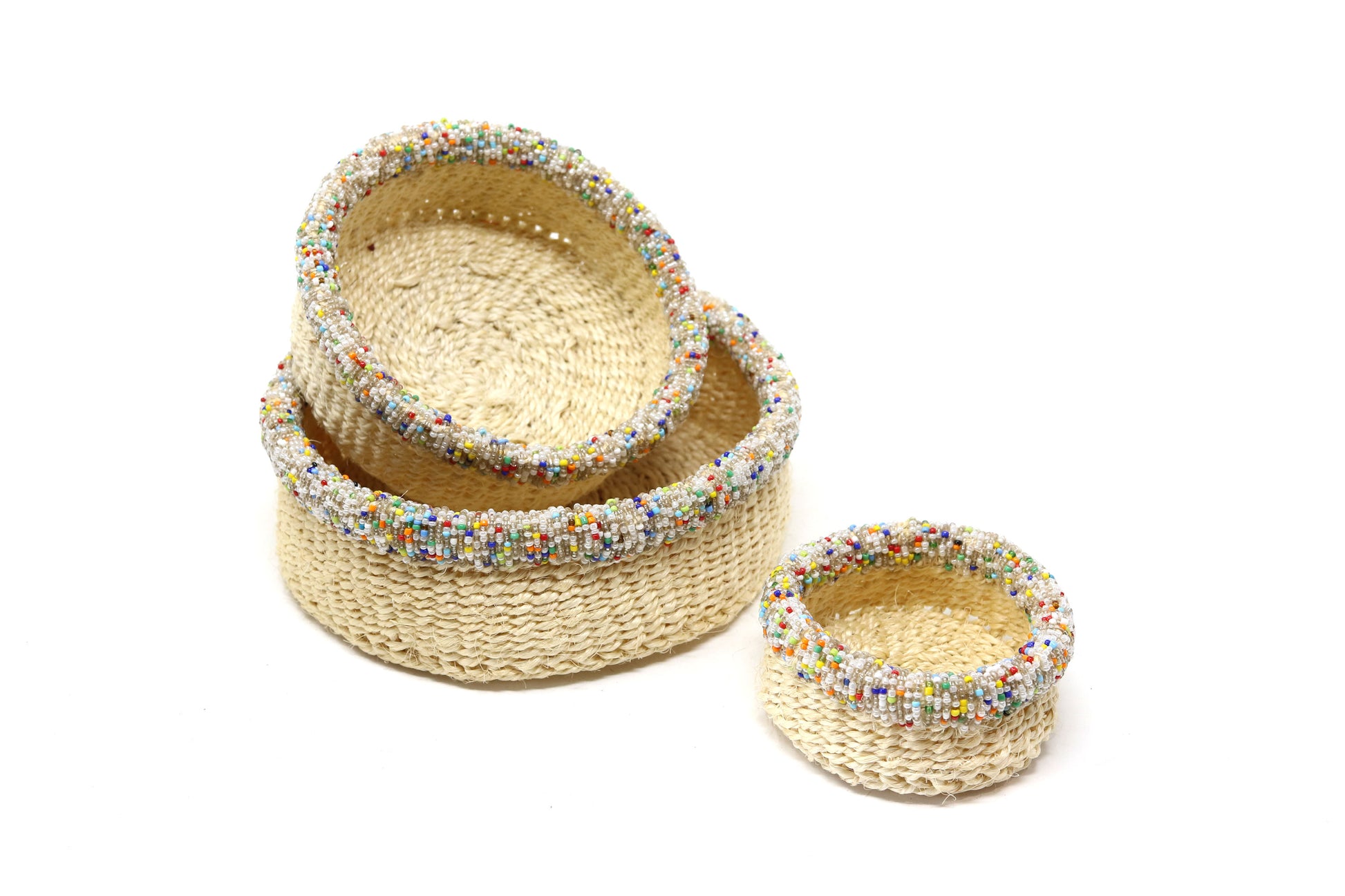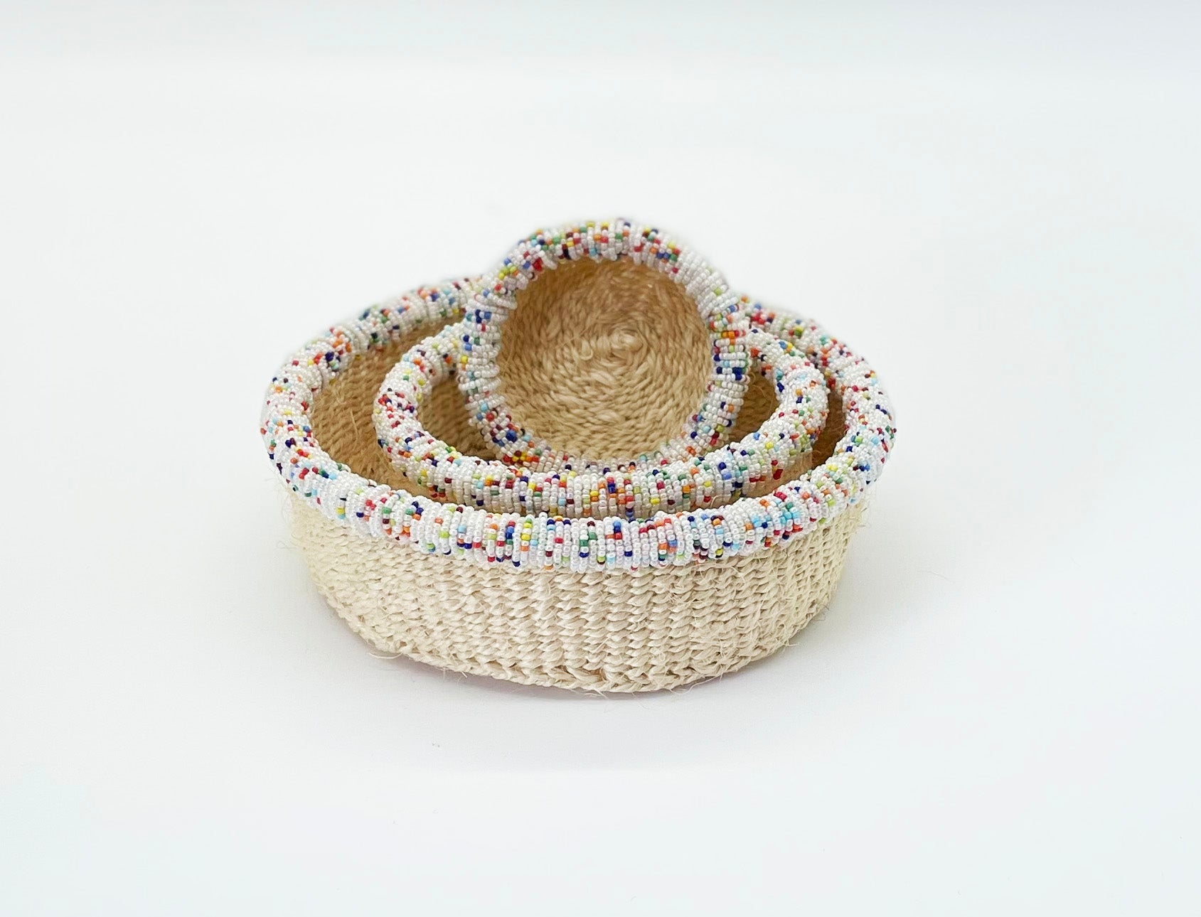 A set of three ivory coloured nesting sisal baskets, hand-woven with a decorative multi coloured bead trim. Perfect for organising your bathroom, dressing table, desk or kitchen.