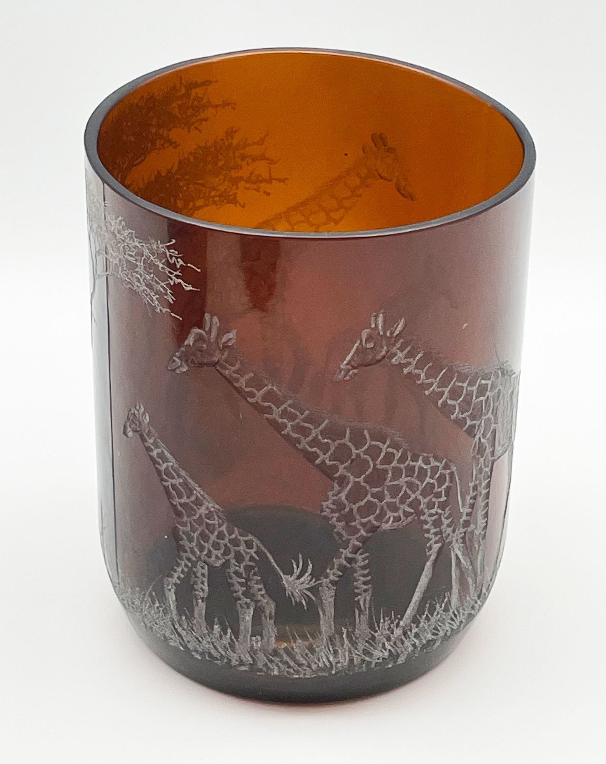 Large brown glass bottle storm lantern, engraved with family of Giraffe.